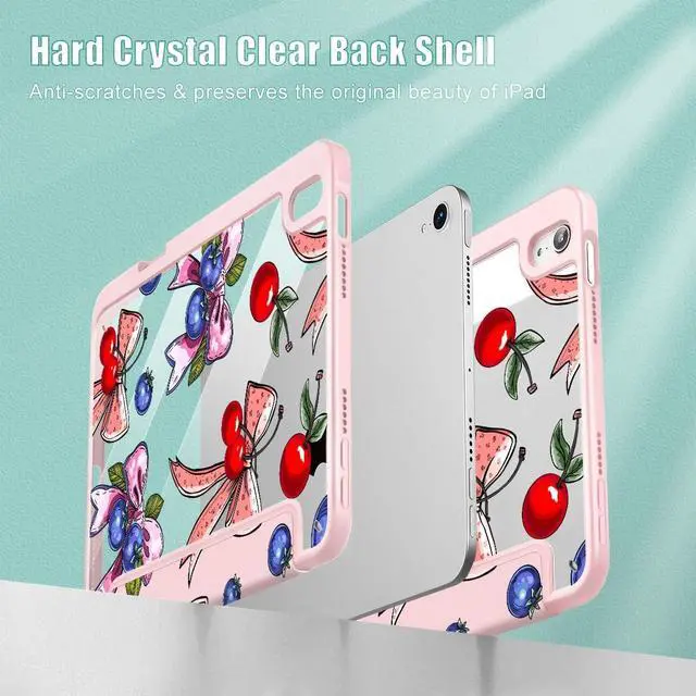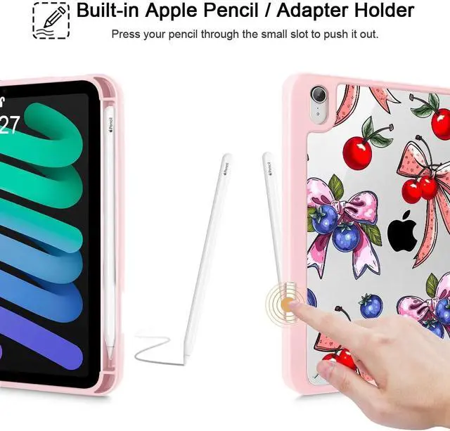 Tuiklol Clear Case for iPad mini 7 (A17 Pro 7th Generation) 2024 / iPad mini 6 (6th Gen) 2021 8.3 Inch,Built-in Pencil Holder Slim Transparent Back Shell Cover Auto Wake/Sleep, Berries Ribbon Pink