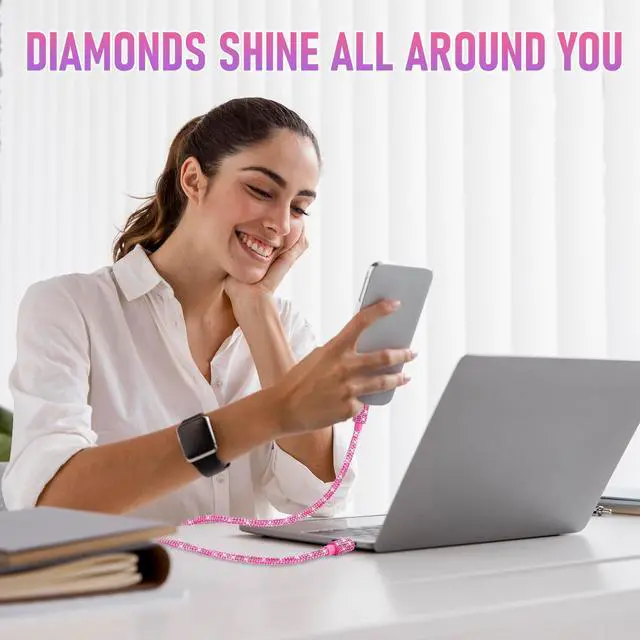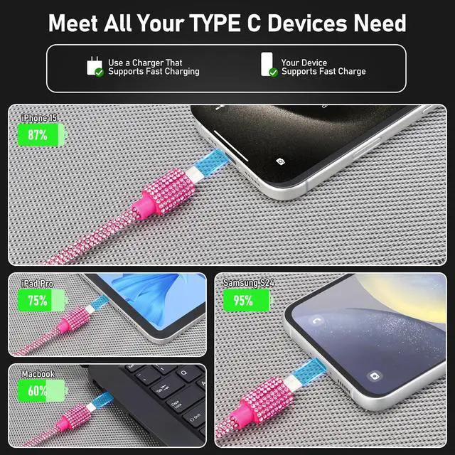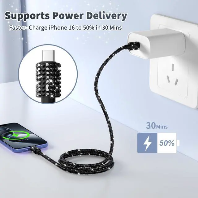 Bling phone chagrer cable with pink and black 2pcs/set. USB C Charging Cable compatible for iPhone 16/16 Pro/16 Plus/16 Pro Max, 15/15 Pro/15 Plus/15 Pro Max, Samsung Galaxy S25 S24 S23 S23+ S23 Ultra/ S22/S21 Ultra, Google Pixel XL, MacBook Pro/Air M2 13'', iPad Air 4/5, iPad 10.9, etc.