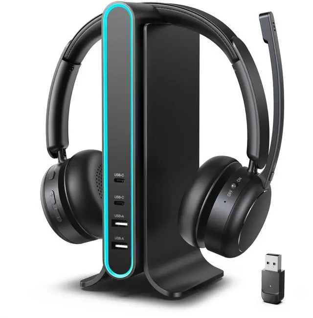Rotatable boom mic can be worn on either side, perfect for extended calls, meetings, or all-day office use ^^ Smart Hub-Based Charging Dock & Easy Power Toggle Its innovative base not only stores and charges the headset, but also serves as a multiport hub with two USBA and two USBC ports. Use it to charge your phone, tablet, and other devices at once, or connect to adaptersall while keeping your workspace tidy and powered throughout the day. The wireless noise cancelling headphones for work also features a dedicated on/off switch for instant call control, eliminating the need for long presses ^^