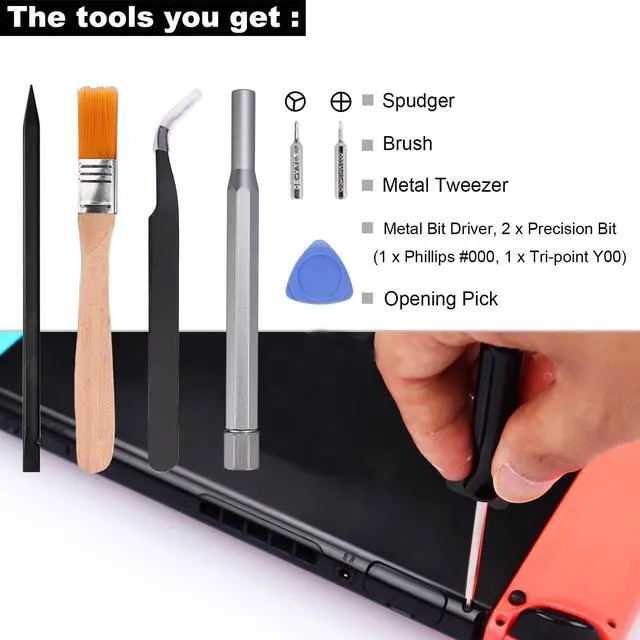 8 x Console screw, Bit Driver, 2 x Precision Bit, Tweezer, Brush, Spudger, Opening Pick. Console Screws-- 8 Reinforced back cover screws for Nintendo switch console witch will he