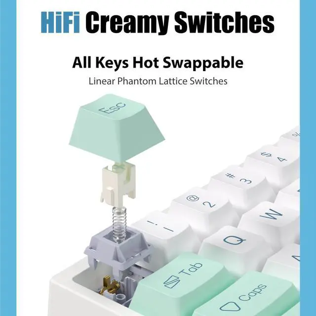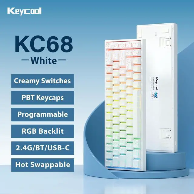 [Tri-Mode Connection & Space-Saving Layout] - This wireless mechanical keyboard supports 3-mode connectivity: 2.4GH z wireless, Bluetooth 5.0, and wired USB-C. You can easily switch between devices using shortcut keys, and Bluetooth mode can remember up to three paired devices. It features a compact 68-key layout, removing the number pad and F1F12 keys while retaining the arrow keys, saving about 45% of desk space compared to a standard 104-key keyboard. The back of the keyboard is designed with ergonomic dual-stage kickstands and silicone anti-slip pads for added stability and comfort. [Creamy Mechanical Switches & PBT Keycaps] - This mechanical keyboard uses premium custom mechanical switches (Phantom Lattice Switches), delivering a stable and smooth typing experience with a Hi-Fi creamy keystroke sound. It is equipped with OEM-profile PBT keycaps, which are far more durable than ABS and resist shine even after long-term use. The unique contour lines and side-printed legends are fully shine-through compatible. [RGB Backlit with South-Facing LEDs] - This illuminated gaming keyboard uses more premium south-facing LEDs, providing a better and clearer backlight viewing angle. It features true RGB lighting with up to 16.8 million colors and 21 lighting effects, supporting both rainbow RGB and single-color backlighting.
