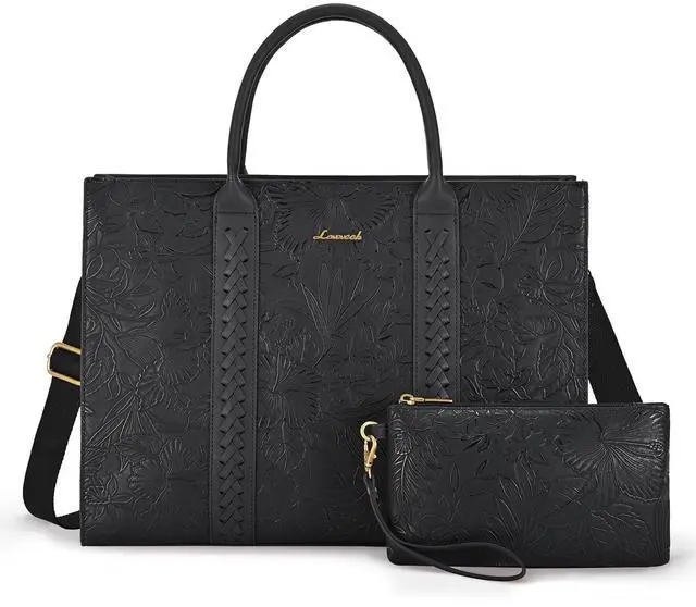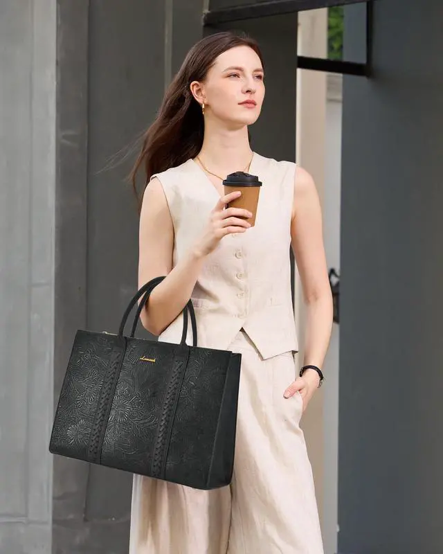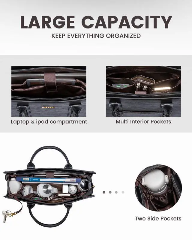 Perfect Size Laptop Bag: Measuring 16.3" x 6" x 12", this multi-pocket leather tote bag boasts ample space with a thick padded laptop compartment (For 13"/14"/15"/ 15.6" laptops), tablet slot, and various pockets for great organization, ensuring a secure and organized commute, daily use or business trip. Designed for the professional modern woman, the leather laptop bag for women marries elegance with functionality. ^^