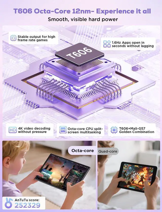Visual Masterpiece Meets Portability Immerse in cinema-grade visuals on a 10.4" inch tablet 2000x1200 IPS display with 84.9 % screen-to-body ratio and 330-nit brightness. The G+G toughened glass ensures 178 wide-angle viewing, while Android 15's split-screen mode lets you juggle 2 apps like a pro. At 0.97LB and 0.33" thick, this 8-core 1.6GH z tablet (tablet android) slides into bags easier than a textbook into a locker. ^^ Octa-Core Multitasking Monster Powered by a T606 CPU + ARM Mali-G57 GPU combo with 36GB RAM (12GB+24GB extended) + 256GB ROM (expandable up to 1TB), this beast scores 252, 329 on AnTuTu.