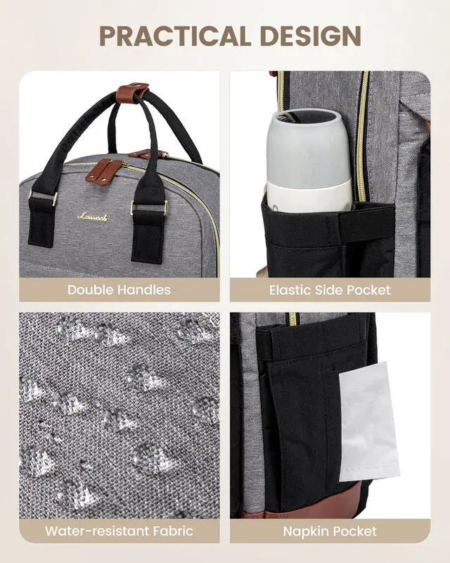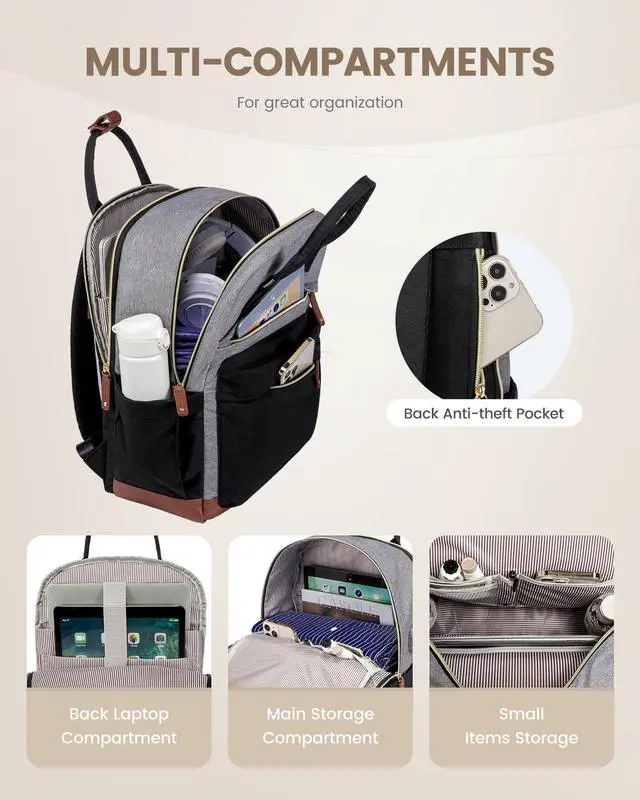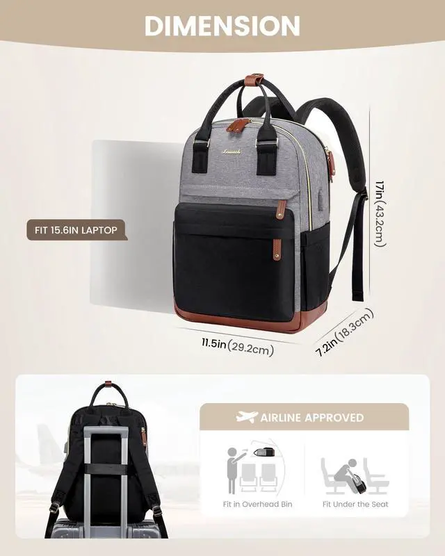 LARGE CAPACITYLaptop backpack has a total of 5 compartments and 17 pockets, which can provide great organization and storage for your computer, A4 folder, books, clothes, etc. ^^ LAPTOP PROTECTIONThe work backpack has a 15.6 inch laptop pocket, a 12.9 inch iPad slot, come with a elastic strap and thick cushion can offer the optimal protection for your devices. ^^ TRAVEL FRIENDLYThe luggage strap allows this travel backpack to securely fit on a trolley case, back anti-theft pocket keeps your valuables safer, makes your travel easier. ^^ USB PORT DESIGNYou can easily connect your phone to the USB port, giving you a more convenient way to charge your phone while walking.