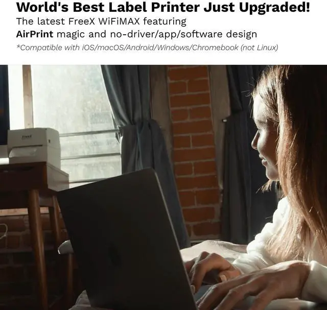 Introducing the ultimate wireless solution for your shipping and labeling needsthe FreeX WiFiMAX thermal printer. Perfect for busy businesses and home offices alike, this printer not only delivers exceptional performance and durability but also brings unparalleled convenience with its advanced AirPrint connectivity. Seamless AirPrint Connectivity for Instant Printing Experience the freedom of driverless printing with AirPrint support on iOS and macOS. Whether you're using an iPhone, iPad, or Macincluding the latest MacBook models with Intel or Apple Silicon chipsyou can print directly from your device without the hassle of installing drivers. Enjoy instant, high-quality printing that saves you time and streamlines your workflow.