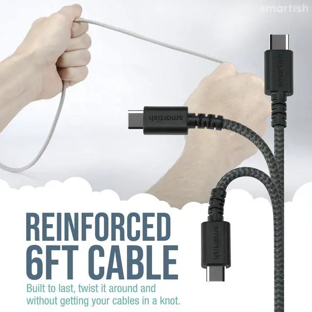 ^^ Built to Last: Ditch the frustration of constantly replacing flimsy cables. This 2-in-1 charger boasts a superior construction with a braided nylon exterior that's built to withstand everyday wear and tear. Reinforced stress points at the connector heads and USB-C tail ensure the cable can endure repeated bends and pulls without fraying or breaking.