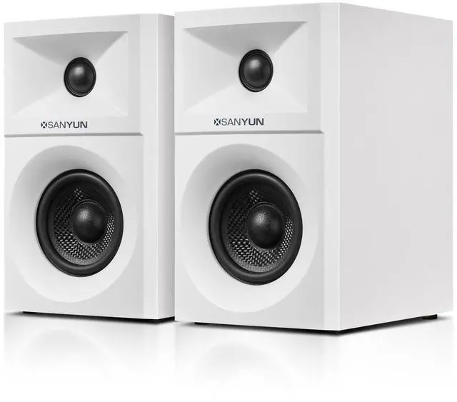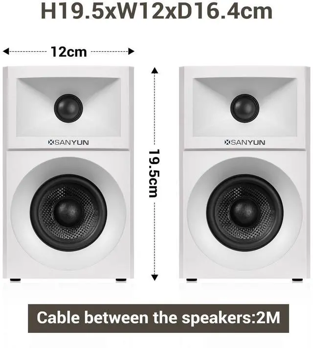 Triple Hi-Fi Connections: Bluetooth 5.4, USB DAC, AUXStream wirelessly with stable Bluetooth 5.4. For the best possible sound, use the USB input featuring a built-in 24bit DAC that processes digital audio directly, minimizing quality loss. The 3.5 mm AUX input offers universal wired compatibility. Enjoy your music your way. ^^ Elegant Wood Cabinet, Compact Desktop DesignCrafted with high-quality MDF wood cabinets to effectively suppress resonance and provide a solid acoustic foundation. Features premium PVC finishes in your choice of White Matte Grain for sophisticated style. Compact dimensions (H 19.5 xW12xD 16.4 cm) fit perfectly on any desk. Includes a 2-meter speaker cable for flexible placement. ^^ Customize Your Sound with Precision ControlsEasily tailor the audio to your preference with dedicated professional-grade knobs on the main speaker's rear panel: Master Volume, Treble, and Bass adjustment. Dial in the perfect sound, whether you crave deep, powerful lows, crisp, detailed highs, or a balanced natural profile.