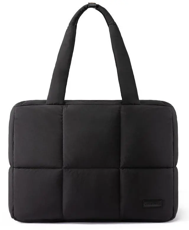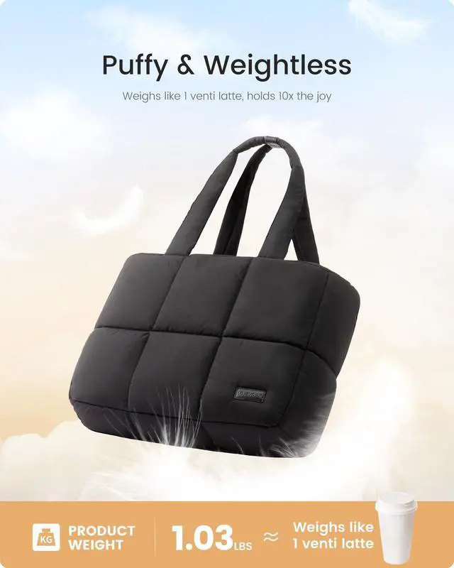 Light & ToughThis puffy tote bag weighs just 1.03 pounds, lighter than an iPad. Made with waterproof outer fabric and soft puffy lining to keep your belongings dry and comfortable. The durable polyester interior resists tearing. Simply toss it in the washing machine for easy cleaning. ^^ Anti-Theft DesignMeasures 17"L 12.5"H 5"W with 11" handles. Padded 15.6" laptop compartment absorbs shocks, while the top hidden theft-proof zip pocket securely holds wallets/passports for worry-free travel. ^^ Spacious & OrganizedFeatures 1 zippered pocket, 2 open pockets and 2 pen slots to keep your essentials tidy.