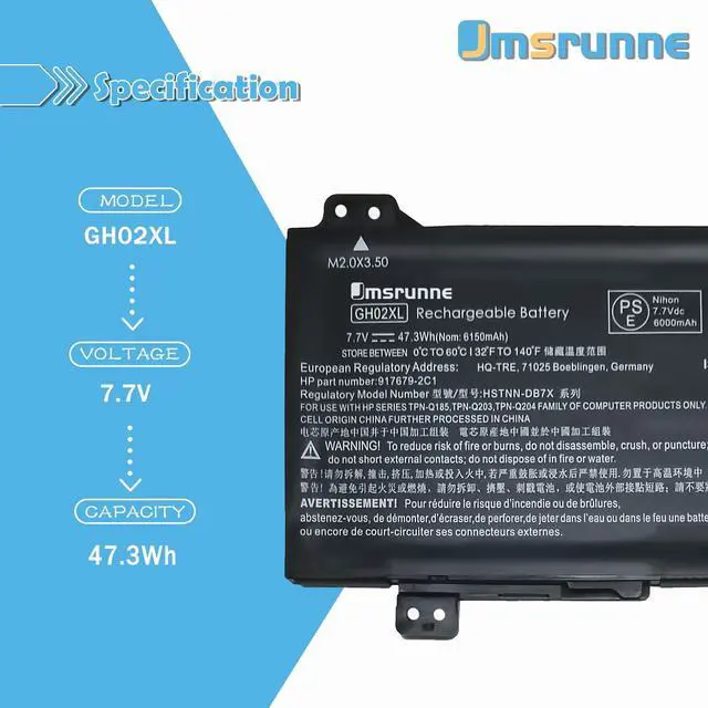 Purchasing Note: Due to the complexity of laptop battery models, you may not be able to accurately determine the model you need to purchase, Please open the back cover of the laptop to confirm the original battery model number ^^ Compatible Laptop/Notebook Models Replacement For HP Chromebook 11A G8 /Chromebook 14 G6 /Chromebook 11 G8 Series; For HP Chromebook X360 11 G3 Series; For HP Chromebook 14A-NA000 NA0010DS NA0010CA NA0010NR Series. ^^ Compatible Part Number GH02XL L75253-271 HSTNN-DB9M GHO2XL GH02047XL-PL HSTNN-IB9C L75783-005 L75253-AC1/L75253-2C1 ^^ TipsIf the new battery is not recognized during the initial installation, please reinstall and check if the interface is fully connected. Discharge the new battery to 5% not 0%, then charge and cycle 3-4 times to wake up the new battery. ^^ Customer Service <1>. 24 x 7 email support. If you have any problem with battery, please Contact us - in YOUR ORDER options click the contact seller. <2>. 30 days return and 12 months Warrant.