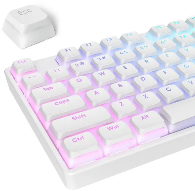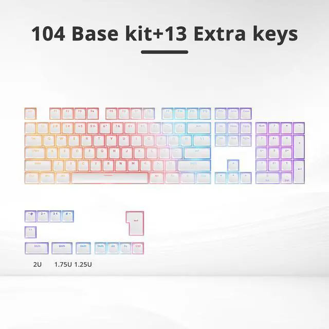 XDA Profile Keycaps-The XDA keycap has a larger surface contact, and the touch area of the finger is also larger. The uniform profile which is perfect for ortho linear ergonomic ^^ Pudding KeycapsThe dual-layered Translucent Keycaps unleashes more light through, making your keyboard's RGB lighting effects more dazzling. The solid white keycaps design brings a really sleek feel to your keyboard. ^^ Doubleshot PBTThese PBT keycaps are made with thick walls and are resistant to wear. Textured finish for a premium look and feel. ^^ Extra Keys for Widely Compatible-Pudding keycaps set contains special shift sizes and modifiers like 1.25 u/ 1.75 u/2u SHIFT keys and L shape enter keys, so it is with more possibilities to customise your keyboard, such as 61/68/82/84//87/104/108 keyboard ^^ What You Get-117 keycaps set include 104 standard keys and 13 supplementary keys.