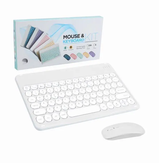 Mini Keyboard and Mouse ComboRechargeable BatteryThe keyboard is built-in lithium battery can last up to 150 hours after fully charged, and the standby time is super long with auto sleep and wake modes. Easy to charge with the included USB cable, no need to change batteries. Quiet and Comfortable TypingThe bluetooth keyboard adopts a scissors switch design, which allows you to have a comfortable and quiet typing experience and enhance your work or entertainment experience and fun. Excellent CompatibilityThe keyboard and mouse compatible with iOS, Android and Windows system. They are perfect for Apple iPhone, iPad, iPad Mini, iPad Pro, iPad Air, Android Samsung Windows Surface tablet cell phone.