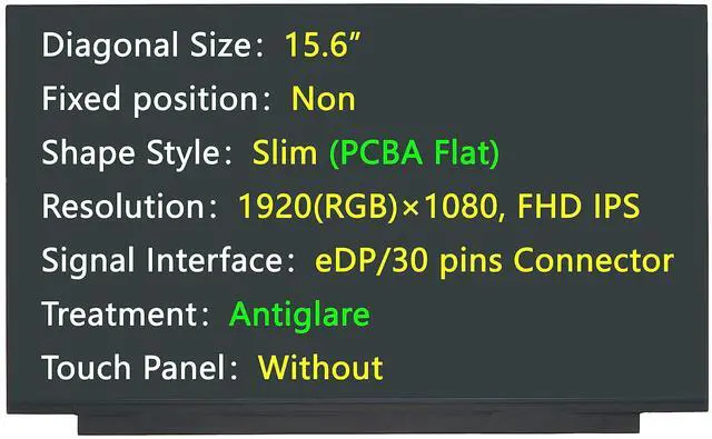 Diagonal Size 15.6F ixed positionNonShape StyleSlim (PCBA Flat); Resolution1920 (RGB) 1080, FHD IPSSignal InterfaceeDP/30 pins ConnectorTreatmentAntiglareTouch PanelWithoutComes with Complimentary Double Sided Stretch Release Adhesive Tape for Installation.