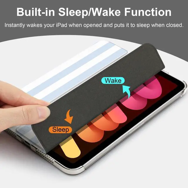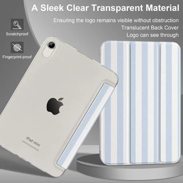 Compatibility -- Designed specifically for iPad Mini (A17 Pro) released in 2024 (Model numbers: A2993/A2995/A2996), iPad Mini 6th Generation 8.3 -Inch 2021 (Model numbers: A2567, A2568, A2569), Not compatible with other iPad models(mini 1/2/3/4/5). ^^ Auto Sleep/Wake Function -- Automatically puts your iPad to sleep when closed and wakes it up when opened, saving battery life. ^^ Trifold Stand -- Adjustable 3-fold design offers two viewing modes: one for media viewing and another for comfortable typing. ^^ Durable & Scratch-Resistant -- The case is made from high-quality PU leather and features a hard PC back, offering excellent protection against scratches and fingerprints. ^^ Transparent Hard PC Back & Soft Microfiber Interior -- The transparent, hard PC back allows you to display your logo while providing strong protection. The soft microfiber interior prevents scratches on your iPad screen and ensures safe handling.