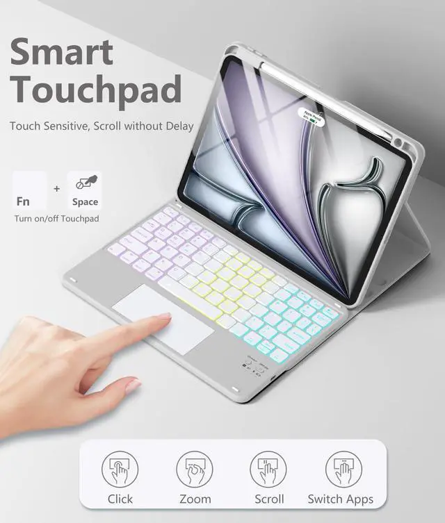 Multi-Touch Trackpad: This for iPad Air 5th generation case with keyboard features a smart trackpad for quick and easy operation of your tablet. Fully supports multi-touch gestures, allowing you to edit documents, create presentations, and browse the web in a whole new way. It also features a row of shortcut keys to adjust brightness levels, volume or change your music with one tap ^^ 7