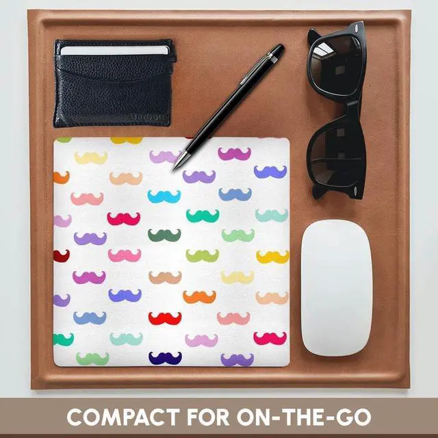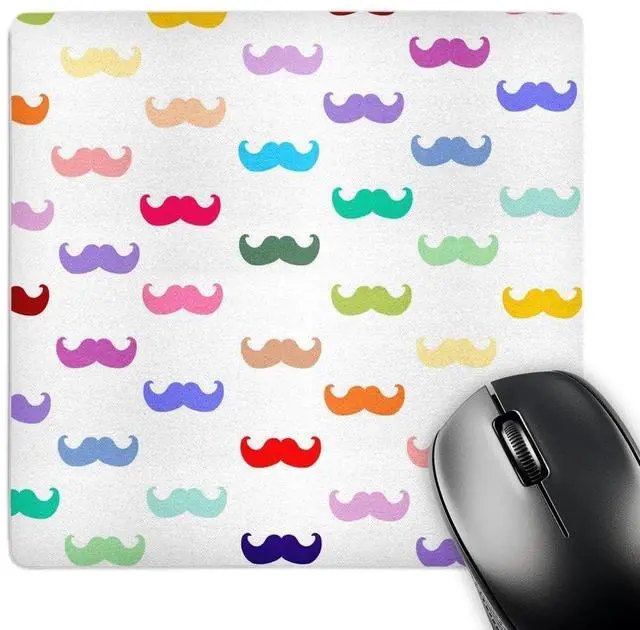 Colorful Rainbow Mustache Pattern on White aka multicolored multicolor funny humorous mustaches Mouse Pad is 8" x 8" x. 25" and is made of heavy-duty recycled rubber. Matte finish image will not fade or peel. Machine washable using a mild detergent and air dry.