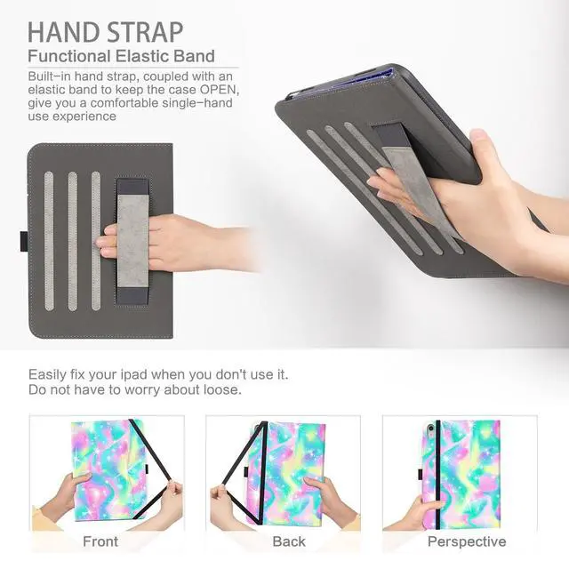 Number: A3354 / A3355 / A3356)Premium MaterialCase for iPad 10th Generation is Made of reinforced external PU leather dual layer construction and soft internal microfiber lining to give you 360 full protectionSmart Auto Sleep/ WakeCase for iPad 10th Gen instantly wakes up tablet when opened, and makes it go to sleep once closed (extend battery life). Upgraded Anti-slip StripesWith three anti-slip stripes, you can adjust it to multiple stable angles, holding up great for viewing, video watching and reading at home, or presenting at your meeting. Hand StrapBuilt-in hand strap, coupled with an elastic band to keep the case OPEN, give you a comfortable single-hand use experienceExternal Elastic BandWhen you don't use it, strap help you more firmer to fix your tablet. Do not have to worry about loss and loose. Front Document PocketDocument Pocket is designed for you to store your business cards, Cash, bank cards, notes or bills while on the go. Pencil HolderStylus Loop is more convenient save your Pencil.