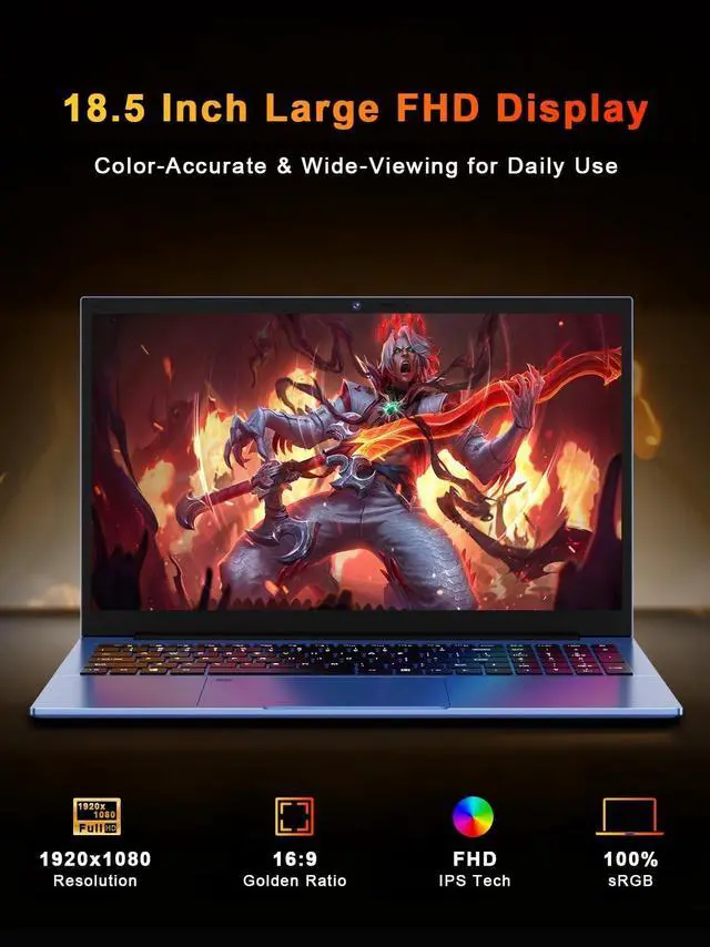 ^^ Display: 18.5 '' IPS Full HD (19201080) LED Screen (Beat LCD) with NTSC 72%photos pop, videos feel real, no washed-out docs. 0.2 '' micro bezel + 88% screen-to-body ratio for immersive views. Anti-glare beats sunny/office glare, wide angles keep sharing sharp.