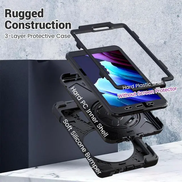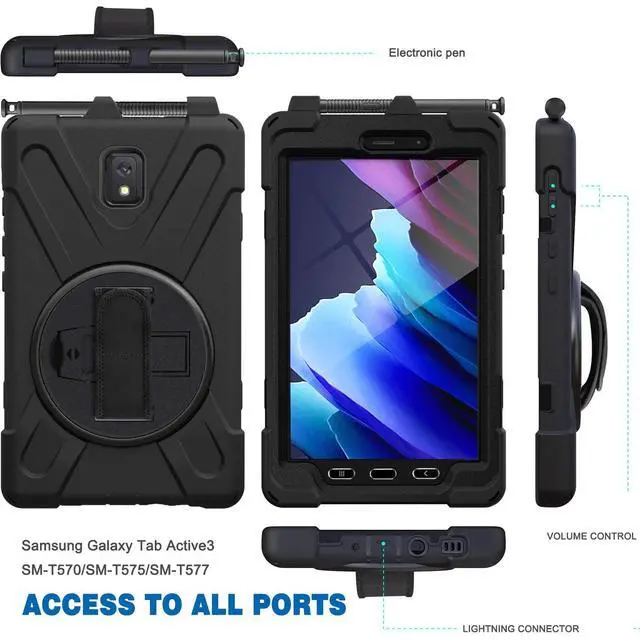 COMPATIBILITY - Designed for Samsung Galaxy Tab Active 5 8.0" 2024 Released (SM-X300/X307/X306B) and Samsung Galaxy Tab Active 3 8.0 inch 2020 Released (SM-T570/T575/T577). With full access to all controls and features your Galaxy tab active 5/3 child case. Designed with a smart holder for stylus/pen (stylus and screen protector are NOT included) ^^ 360 DEGREE ROTATING AND FOLDABLE KICKSTAND - Provides multi-angle viewing for watching videos, conferences, or typing. Ideal for kids, toddlers, students, teachers, office workers, engineers, etc. Great holiday/birthday gift for family and friends ^^ With a rotatable and adjustable handle hand strap, easier to use your tablet with one single hand in your outdoor traveling, working, and gaming with kids ^^ With an adjustable and removable carrying shoulder strap, hang it anywhere for better entertainment, your Galaxy Tab Active 5/Active 3 8.0" tablet can be carried vertically or horizontally in a more secure way during any outdoor activities ^^ HIGH QUALITY MATERIAL - 3 Layers structure of Galaxy Tab Active 5/Active 3 kids case made of Hard PC and Flexible Soft Silicone, Military Grade Material provides tablet comprehensive protection.