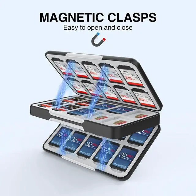 LARGE CAPACITYThis sd card holder can store 40 SD SDHC SDXC Cards & 40 Micro SD Cards to meet your daily memory cards storage needs. ^^ FULL PROTECTIONMade of ABS plastic and soft silicone lining, the sd card case can effectively protect the card from impact. ^^ MAGNETIC CLASPSBuilt-in magnetic clasp design makes the sd card holder case easier to open and access. ^^ PORTABLE DESIGNThe micro sd card holder case storage is lightweight and small size, you can easily put it in your backpack for easy portability.