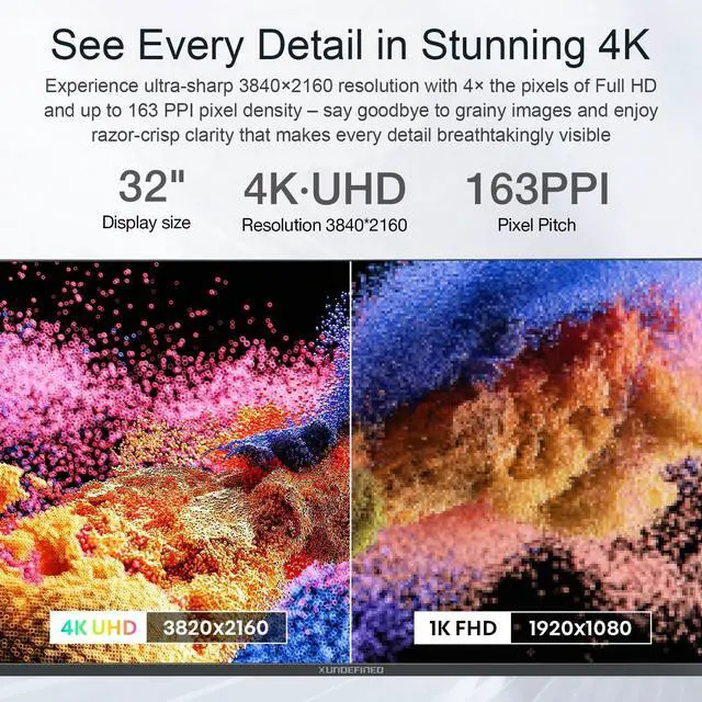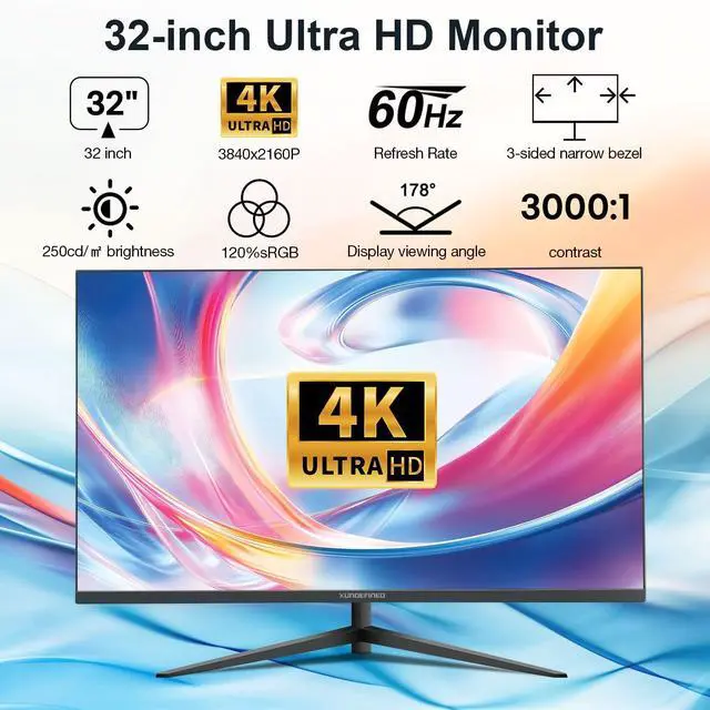 , This 32 inch monitor delivers stunning 3840x2160 resolution (4x the pixels of Full HD) for unmatched detail, Perfect for creators to tackle complex designs, intricate charts, and video editing while immersing gamers in ultra-vivid environments ^^ Pro-Grade Color Performance, Experience breathtaking true-to-life visuals with 120% sRGB coverage and 16.7 million colors for exceptional accuracy. Whether you're a photographer editing RAW files, a designer perfecting 3D renders, a gamer diving into rich worlds, or streaming 4K movies, this 32 inch 4k monitor delivers vivid, immersive colors that pop like never before ^^ Experience Buttery-Smooth 4K Gaming With Zero Screen Tearing or Stuttering, Powered by Adaptive-Sync technology, this uhd monitor syncs perfectly with your GPUs frame rate for smooth visuals every time.Details