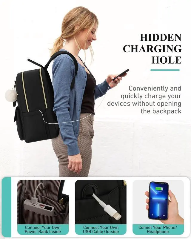Charging Easily: Design with a charging hole. Offering you a more convenient way to charge your phone while walking. You can charge the phone via the side pocket's hole so that you dont need to take the portable charger all the time. Just keep your phone powered up on the go. Please noted that the backpack can not power itself, charging hole only offers an easy access to charge ^^