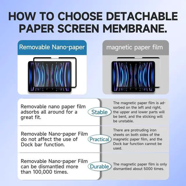 Perfect for extended note-taking, sketching, or video editing ^^ Reusable & Washable, Long-Lasting ValuePremium PET material lets this protector be removed and reused over 50 timesswitch between bare screen and paper film easily. Rinse with water and wipe dry to clean dust, oil, or smudges, restoring full adsorption and clarity. Save money by avoiding frequent replacements. ^^ Nano Adsorption, Bubble-Free Easy InstallAdvanced nano adsorption (no glue needed) align with iPad Air 6 13-inch screen, press gently to stick instantly, zero bubbles. Beginners finish in 30 seconds.