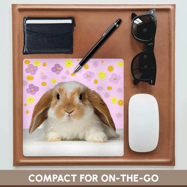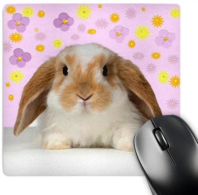 Rabbit Mouse Pad is 8" x 8" x. 25" and is made of heavy-duty recycled rubber. Matte finish image will not fade or peel. Machine washable using a mild detergent and air dry.