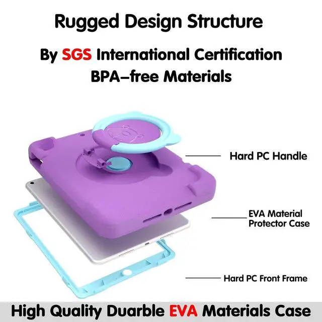 ^^ Design: The 360 rotating +180 folding bracket consists of a cute bear on the back of the case. The multi-function handle is easy to carry, adjust the bracket, and adjust the viewing angle from multiple angles to viewing the media.