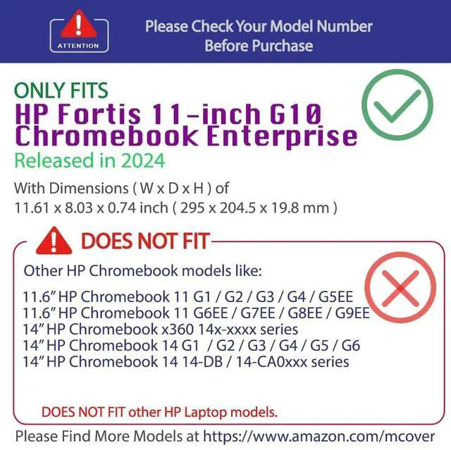 NOTE: Before placing order, PLEASE make sure to verify your laptop model number as this case is MODEL specific and NOT interchangeable. ^^ NOT fitting other HP Chromebook laptops. NOT compatible with ANY other HP laptops as well. ^^ Made of high-quality translucent polycarbonate material which is shatter-proof and will protect your 2024 11.6" HP Fortis 11 inch G10 Chromebook Enterprise laptop computers all around ^^ Designed to perfectly fit the 2024 11.6 -inch HP Fortis 11 inch G10 Chromebook Enterprise laptop computer with dimensions (w x d x h) of 11.61 x 8.03 x 0.74 inch ( 295 x 204.5 x 19.8 mm ) ^^ 2-piece light-weight ( 8.3 oz or 235 g ) shell easily snaps on and off.