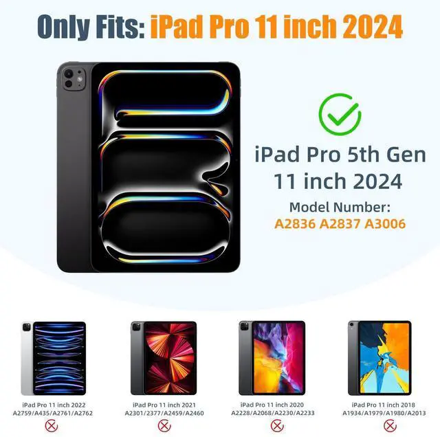 Compatible with iPad Pro M4/M5 Case 11 inch 2024/2025This case is designed specifically for iPad pro 11 inch case 5th Generation 2024 and for iPad pro M5 11 inch case 2025; It is not compatible with any other devices. Please verify the model number (A2836 A2837 A3006) located on the bottom of your device before making a purchase.