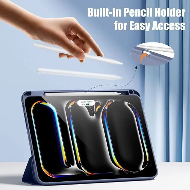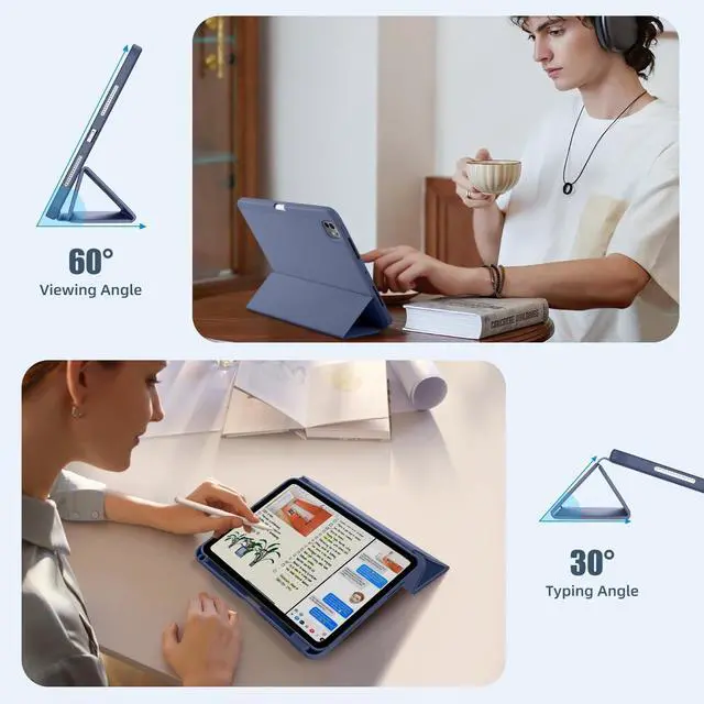 (Please note: Pencil is not included) ^^ Two Different Angles in UseThe trifold design for iPad case with pencil holder provides two convenient viewing angles for everyday use. Adjust it to 30 when typing, drawing, or chatting, and to 60 for watching videos, handling emails, or video calls. Choosing the correct angle ensures a more comfortable experience in various positions. ^^ Auto Wake & SleepThe magnetic 11 pro case supports auto wake functionality, eliminating the need to press any buttons. Its auto-sleep feature extends standby time, conserving energy and reducing the frequency of charging for iPad pro 11 inch case.
