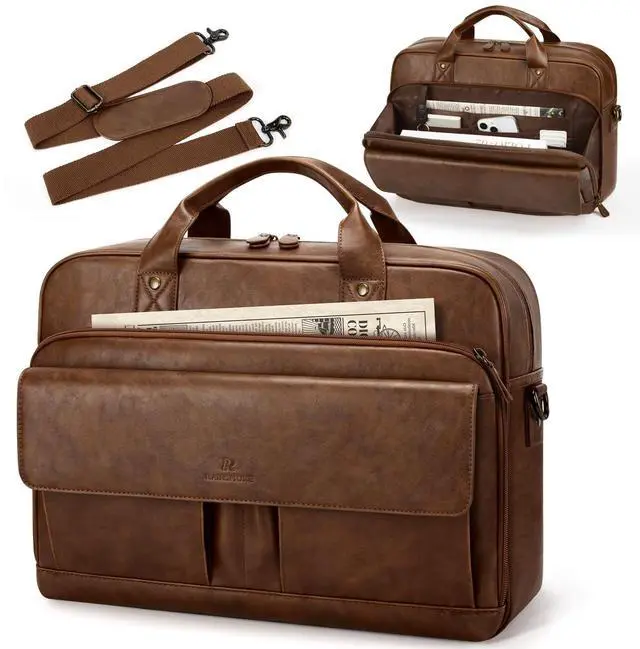 Perfectly Sized Mens Briefcases - Sizes in 43cm x 34cm x 13cm ( 16.9" x 13.3" x 5.1" ), this spacious laptop briefcase is ideal for work and business trip. It includes a dedicated padded laptop compartment that securely fits most 15.6 inch laptops and tablets, keeping these tech devices safe and easily accessible. The interior zipper pockets of the briefcase storage your passport, wallet, phone, or other valuable items safe ^^ Leather Laptop Bag for Superior Organization - Front wide-opened compressive compartment (include 3 slip pockets and 4 card slots) impeccably organize your files, folders, magazines, notebooks and business cards.