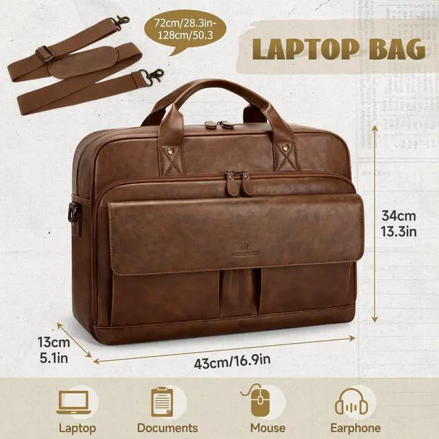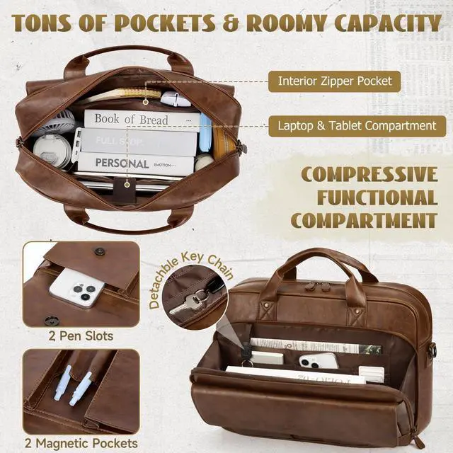 2 front pen holders and 2 magnetic pockets of the laptop bag for quick access items you need on the go. No more diggingeverything has a dedicated place for instant access ^^ Versatile Carrying Options - Enjoy ultimate flexibility with the detachable and adjustable shoulder strap (72cm-128cm / 28-50 inches). Convert the laptop bag as a classic shoulder bag, satchel or a sleek laptop briefcase according your need. The integrated luggage strap allows you to securely attach this laptop bag to your suitcase handle, making business trips effortless and hands-free ^^ Premium & Stylish Messenger Bag - The vintage-inspired messenger bag for men is complemented by premium waterproof PU leather and corrosion-resistant metal hardware.