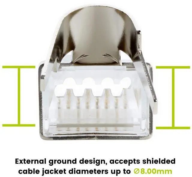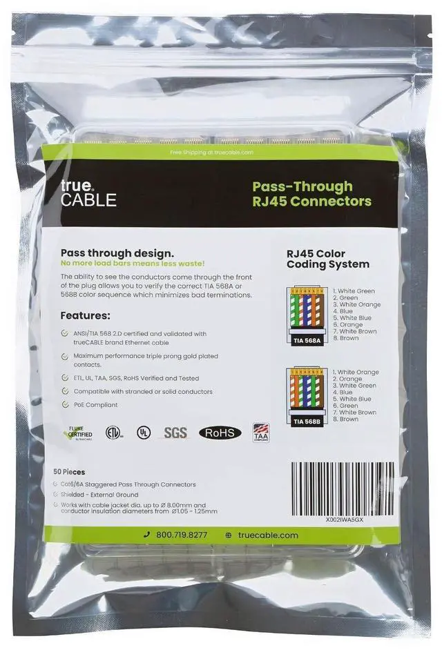 Supports Power over Ethernet: PoE/PoE+/PoE++ (IEEE 802.3 af/at/bt) 4PPoE up to 100W. ^^ [Versatile] Compatible with 23AWG stranded or solid conductors. Suitable for cable jacket diameters up to 8.00 mm and conductor insulation diameters from 1.05 - 1.25 mm. Terminate and crimp external ground tab with the trueCABLE all in one V2 tool. ^^ [Premium Quality] ANSI/TIA 568 2. D Certified and Validated with trueCABLE F/UTP Ethernet cable. ETL, UL, SGS (RoHS REACH / SVHC) Verified and Tested. FCC compliant. ^^ [Resealable Bag] These shielded pass through RJ45 ends are sure to make your install hassle free.
