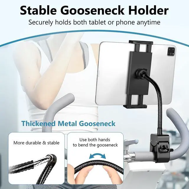 Your Perfect Fitness CompanionThis tablet holder is designed for quick and tool-free installation and removal. Easily attach your device to a spin bike or treadmill to enjoy music, watch videos, or capture photos and videos of your workout. It's an essential accessory for fitness enthusiasts who want to document their progress or stay entertained while exercising ^^ 360 Swivel iPad Holder MountThe handlebar mount features an innovative ball joint mechanism, enabling seamless 360-degree rotation. With just one hand, you can effortlessly adjust your smartphone or tablet to either horizontal or vertical orientation.