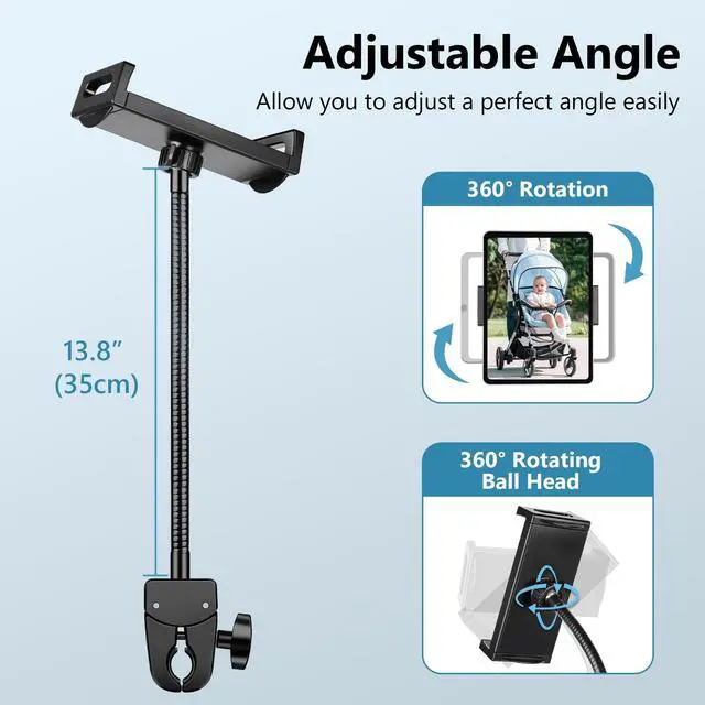 35cm gooseneck mount offers flexible adjustability, ensuring optimal positioning. This robust design not only provides versatile adjustability but also guarantees stability ^^ Handlebar Compatibility The adjustable clamp base is designed to fit a wide range of handlebars, pipes, or tubes with diameters ranging from 0.5" to 1.6" (14-38mm). Suitable for stroller, treadmill, boat, wheel chair, music stand, elliptical, spin bike, shopping cart, indoor stationary bicycle, golf cart. ^^ Durable and Stable ConstructionThe base of the bicycle mount is equipped with soft, non-slip rubber pads, ensuring a firm and secure grip on the handlebar without any risk of slipping.