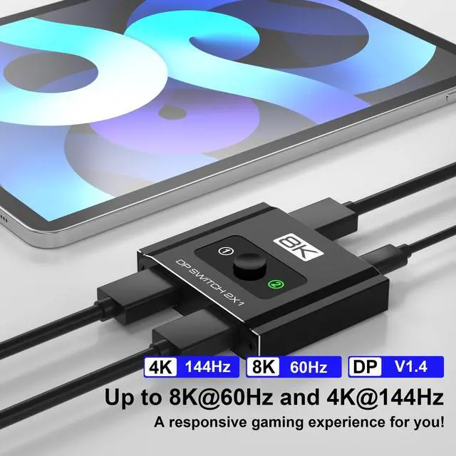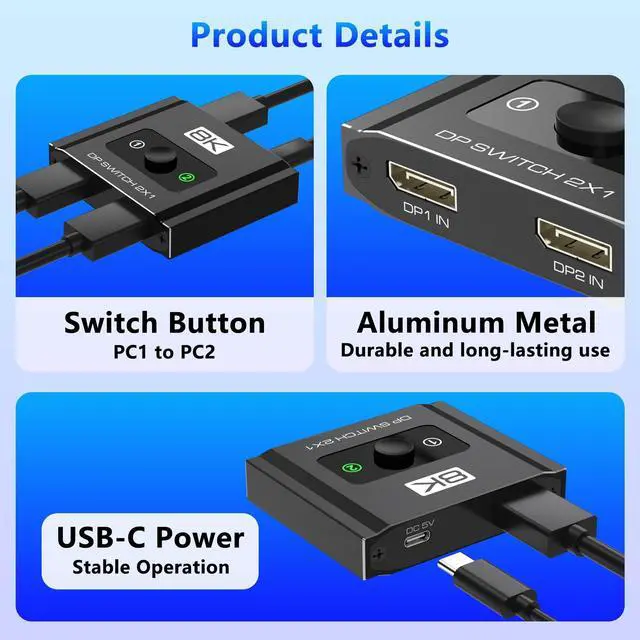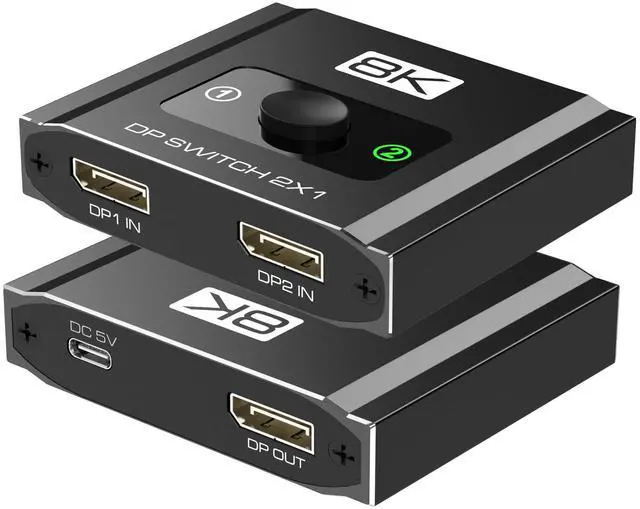 Note: Some hubs or DP adapters may cause compatibility issues we recommend connecting directly when possible. ^^ 32.4G bps High-Speed Data TransferSupports high-speed 32.4G bps data transfer, lag-free signal transmission. The displayport switch ensures synchronized audio and video, stable picture quality, and minimal data loss, Say goodbye to dropped frames, stutters, or signal loss. Making it perfect for gaming, streaming, or professional work. ^^ Sleek Aluminum ShellDurable & Plug-and-PlayCrafted with a durable aluminum housing, this switch is lightweight, heat-resistant, and impact-resistant. making it perfect for both desktop setups and travel use. Plug-and-play design with no drivers required. Switch between devices instantly using the tactile manual button or auto-detect mode. USB power cable included for enhanced stability. ^^ Wide Compatibility & ProtectionSupports DisplayPort Alt Mode and includes ESD protection for safe handling. Compatible with RTX 3080, AMD RX 6000 series, MacBook Pro (via DP adapter), and more. Not compatible with HDMI/VGA. For best results, use VESA-certified DP8K cables and ensure DSC support for 8K.