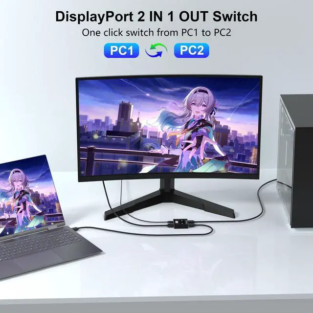 DisplayPort Switch 2 In 1 Out Easy Device SwitchingThe DisplayPort switch lets you connect two DP input devices (like PCs or laptops) to one DisplayPort monitor, so you can effortlessly switch between devices with the press of a button no need to plug and unplug cables.