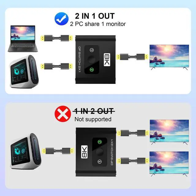 Note: This is a one-way switch (2 input to 1 output) and is not compatible with KVM setups. A USB power supply is required for operation. ^^ 8K@60Hz & 4K@120Hz Ultra High Definition OutputThe display port switch supports 8K@60Hz (with DSC) and 4K@120Hz resolutions, along with HD audio output, for crystal-clear visuals. For the best results, please make sure your source device, monitor, DP cables, and adapters support the desired resolution and refresh rate. To avoid screen flickering or blackouts, use a DP 1.4 cable no longer than 3 meters when running 8K@60HzNote: For stable 8K@60Hz or 4K@120Hz performance, use a high-quality 5V/2A+ power adapter (Not Include) ^^ High Compatibility & Reliable PerformanceEquipped with an advanced chipset and high-quality materials, this DisplayPort switch is compatible with TVs, monitors, projectors, PCs, and laptops.