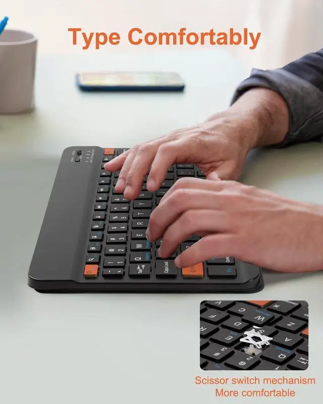 Wide Compatibility, 3 System SwitchingSuitable for mobile phones, tablets, and computers, including iPhone 17/16/15/14/13/12 generations, Samsung Galaxy Z Fold7/S25/S24/A25/A16, Motorola Moto G, Google Pixel 9a, etc. iPad 9.7 / 10.2 / 10.5 / 10.9 / (a16) 11 inches, iPad 6/7/8/9/10/11, Air 3/4/5, Pro 11, Samsung Galaxy Tab 10.1 / 10.4 / 10.5 /11 inches A9/A11/S10 Lite/S10/S9/S9/A9Plus, etc. Just click "Fn" and "Q" or "W" or "E" to easily switch between Android, Windows, and iOS systems ^^ Ultra-Slim and Portable with PU MaterialThis slim keyboard ( 9.7" x 6" x 0.43", 12 oz) fits easily into a briefcase or laptop bag.