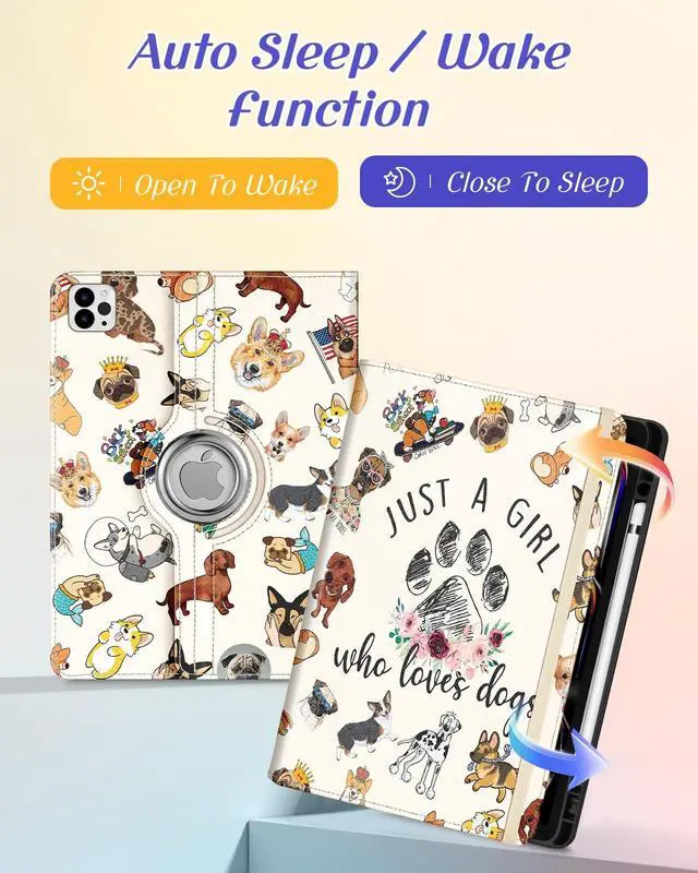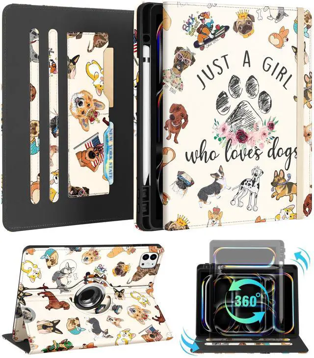 Kidcube for iPad Pro 13 Inch Case M4 2024 - Women Girls Kid Cute Rotating Stand Folio Cover with Pencil Holder & Card Slot Kawaii Cartoon Dogs Design for iPad Pro 13 Inch Case 2024 (A2925 A2926 A3007)