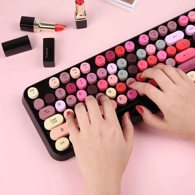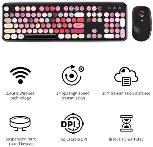 Black Colorful Wireless Keyboard and Mouse - Warranty We offer a three-year worry-free warranty and a 60-day money-back guarantee or replacement option. If you have any inquiries or concerns regarding our colored wireless keyboard and mouse, please don't hesitate to contact us. Your satisfaction is our top priority. ^^ Fashion & Quiet Mouse Design Desk Accessories Keyboard - Stylish retro keyboard and mouse wireless with colorful round 104keys and glossy smooth edges to brighten your workspace. Featuring low-profile whisper-quet technology, this sleek combo ensures a distraction-free typing experience. Perfect for modern desks seeking cute wireless keyboard and mouse aesthetics.