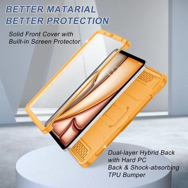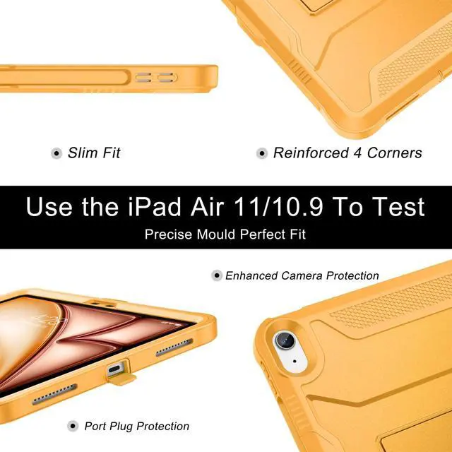 Generation 2020 (Model number: A2316, A2324, A2325, A2072). Please kindly check the model number A*** at the back of the tablet or Setting before purchase ^^ Rugged Armor Shockproof ProtectionMulti-layered hard PC back and flexible TPU bumper provide your iPad Air 11 and iPad Air 5/4 strong protection against drops, bumps, and impacts, also easy to install ^^ Built-in Screen ProtectorPrevents your New Apple iPad Air 11 Inch 7th/6th Gen & iPad Air 10.9 Inch 5th/4th generation screen from scratches without compromising sensitivity and provides full protection ^^ Precise cutoutsPrecise cutouts and design allow easy access to all ports, sensors, speakers, cameras without removing the case. Fully supports Pencil Pro/2nd Gen Pencil magnetic charging and Pencil (USB-C) wireless attach to keep your Pencil securely ^^ Built-in KickStandThis case for iPad Air 11 Inch & iPad Air 5th/4th Generation 10.9 Inch functional pop-out kickstand with dual stand angles for easily enjoying movies and better working. FREE YOUR HANDS