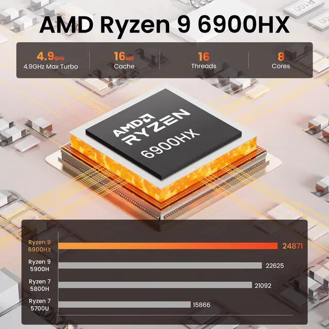 Perfect for tasks such as video conferencing, large file transfers, and online collaboration. Coupled with the fast and efficient WiFi 6 and Bluetooth 5.2, the EQR6 Mini computer delivers a seamless and powerful performance for both work and entertainment ^^ Multi-interfacesThe mini pc Ryzen features 2 HDMI ports supporting 4K@60Hz dual screen display, providing high-definition video output and flexibility of multitasking. With 3 x USB 3.2 and 1xType-C ports boasting a transfer speed of up to 10Gbps seamless data transfer and device connectivity are effortlessly achieved. The dual RJ45 1000M port ensures stable wired network connections. In addition, it is equipped with 1 x USB 2.0 ports and 1 x 3.5 mm Phone Jack*1(Two-in-one) ^^ Brand new ProcessThe built-in power supply of this mini pc enhances portability, reduces weight, and keeps desktop tidy and stylish. 6900HX mini pc uses heat treatment MSC 2.0, upgraded air ducts, and VC vapor chamber for more efficient heat dissipation, lower fan speed, low decibels, and super quiet operation. It also employs a new dust-proof design with a high-density breathable etched metal mesh at the bottom to prevent dust accumulation inside the machine and ensure trouble-free operation