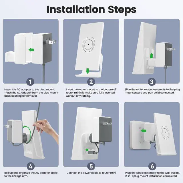 Its minimalist design enables clutter-free installations in RV, home, office, and outdoor wall the ultimate Starlink accessoriesfor reliable satellite internet connectivity anywhere ^^ Easy to InstallEffortlessly insert the AC adapter to the plug mount ( hint: Push the AC adapter from the plug mount back opening for removal ), then securely attach the router mount to the bottom of router mini slit, make sure fully inserted without any rattling. Neatly organize excess cables around the linkage armno holes, no tools, just a seamless plug-and-play experience perfect for home, office, or RV setups ^^ Durable and StabilityStarlink mini mount is made of high quality ABS plastic, sturdy and stable. Engineered for protection, it shields your equipment from harm while optimizing signal strength to ensure unwavering internet connectivity a dependable solution for home, office, and RV setups ^^ Signal OptimizationThis Starlink mount securely holds your Starlink Router Miniat an optimal wall height and angle, reducing physical obstructionsand minimizing interference from other electronics. By maintaining clear line-of-sightto devices, it helps sustain your router's original signal strengthin home, office, and RV environments
