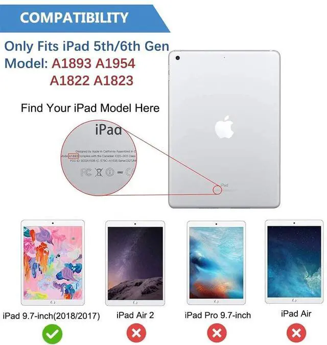 • Compatibility: Specially designed for the iPad 6th generation 9.7 inch 2018 and iPad 5th generation 9.7 inch 2017. Fit model: A1822, A1823, A1893, A1954. NOT compatible with other iPad tablet models. Please check the model at the back of your ipad before purchase