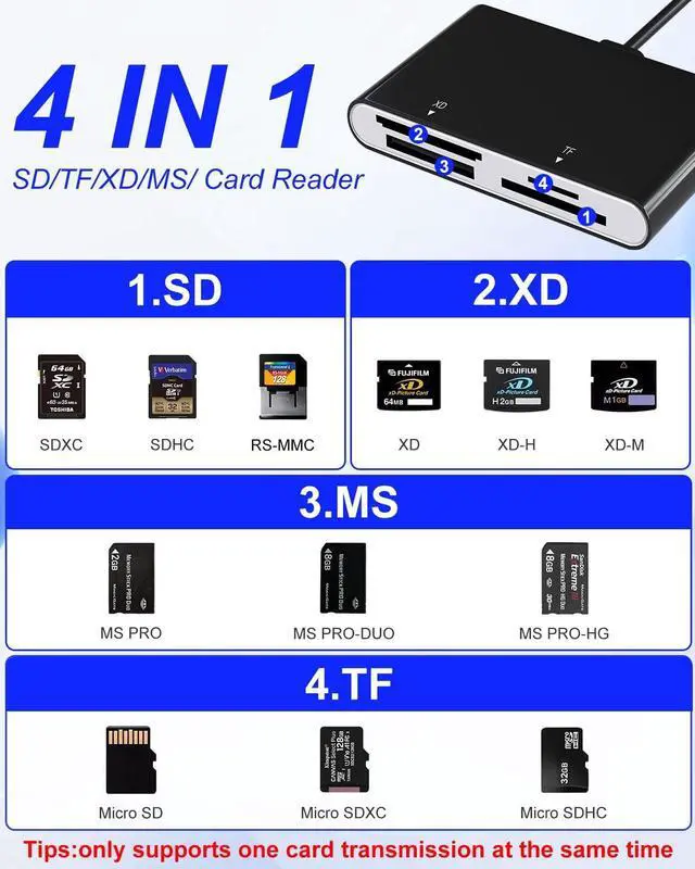 4 in 1 Multi-Card Reader This memory stick pro duo card reader features slots for SD, TF, MS and XD cards. It supports a wide range of formats including XD, SDXC, SDHC, SD, MS, MICRO SDXC, Micro SDHC and Micro SD cards. The 4-in-1 design offers greater efficiency and convenience, allowing you to access multiple storage cards without carrying several separate card readers. ^^ 3 in 1 interface (Lightning + USB-C + USB-A) - Ms pro duo adapter features a triple-port design: Lightning + USB-C + USB-A. Solving all port compatibility issues! This xd card adapter is compatible with ms card reader for iPhone 16/15/14/13, iPad, Mac/PC/iPad, as well as for Samsung, Google, Android devices and computers. No need to carry multiple card readers for different devices. Extensive compatibility enables more efficient access for laptops, tablets and mobile phones. ^^ 480Mbps Fast Data Transfer - Xd picture card reader 480Mbps High Speed Card Reader delivers rapid and seamless data transfer. Achieving theoretical peak speeds of up to 60MB/s, it effortlessly handles bulk photo transfers, high-definition video processing and large file operations. Plug-and-play functionality ensures efficient and stable performance, significantly enhancing workflow productivity. An indispensable tool for photographers and videographers. ^^ Supporting High-Capacity Storage and Broad Device CompatibilityThis xd picture card adapter accommodates cards up to 2TB, making it ideal for use with cameras, GoPros, drones, dashcams, smartphones, and surveillance systems. Whether you're a photographer or a tech enthusiast, this card reader delivers robust performance across all your devices. ^^ Important Notes - 1) Ensure the memory card is formatted to a supported file system (e.