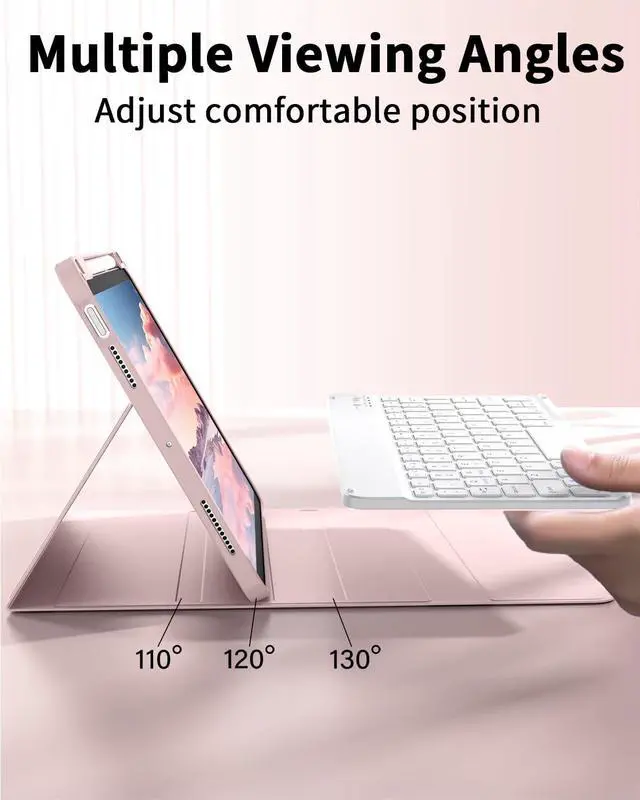 (Note: pencil is not included) ^^ Multiple Viewing Angle and Auto Sleep WakeThis Keyboard Case adopts magnetic adsorption and can be firmly fixed on the case, so it can provide a variety of stand angles for adjustment at any time. Move iPad forward or backward along the case to choose the angle that works best for your comfort. Built-in magnetic strip, support smart automatically wakes or sleep function, easily wake or close your iPad at any times, it can better save tablet power and extend its service life ^^ Package Content and