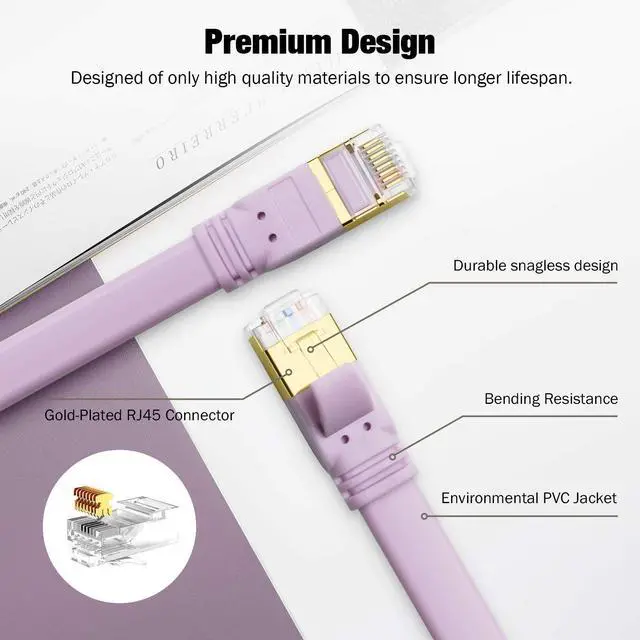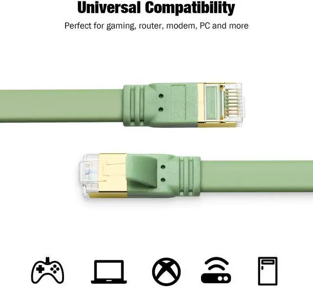 ^^ Flexible and durable Made of 4 pairs of 100% 26AWG pure thick shielded twisted copper wire, effectively reduce EMI/RFI interference and maintain stable internet speed. The flat design is suitable for complex environments. Improved soft PVC provides a durable cable jacket that is abrasion and corrosion resistant, without the need for frequent cable replacement. ^^ Universal CompatibilityCAT 8 Ethernet cable is backward compatible with CAT7/CAT6/CAT6e/CAT5e/CAT5 cable standard. With 2 gold-plated RJ45 connectors, perfect for connecting routers, switches, modems, IP cameras, PCs, network adapters, hubs, Xbox, smart TVs, laptops, and more.