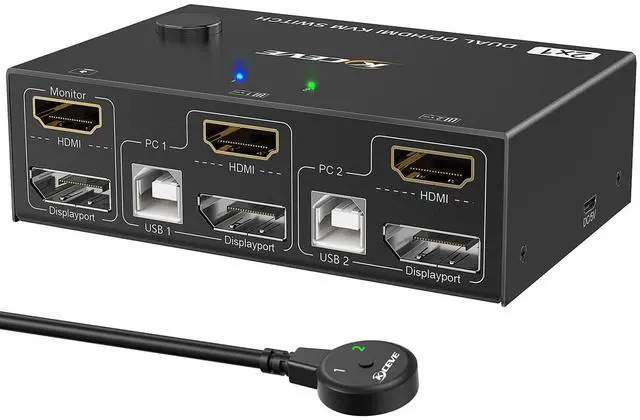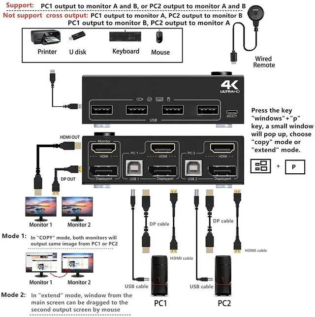 HDMI + DP Port KVM SwitchThis is a perfect KVM switch for DP and HDMI ports device to share keyboard mouse and monitor. When in copy mode the main screen can be copied to the second output screen. When in extend mode, the window from the main screen can be dragged to the second output screen. ^^ Support 2 Switching ModeSupport physical button and wired control. Only when your computer supports dual display or multi display, you can use this DP HDMI KVM switch to achieve two computers to share two monitors, please choose extended mode or copy mode in your computer.